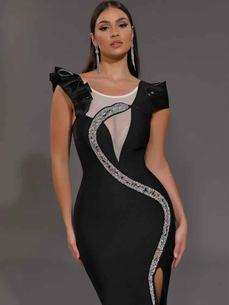 The Black Snake Dress combines the timeless charm of the color black with a sophisticated snakeskin pattern. Perfect for special occasions or a chic everyday look, this dress enhances the silhouette while adding a mysterious and daring touch.